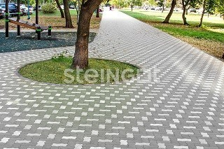 Распространенная форма, также известная под названием «Волна». Благодаря уникальной конструкции мощение из этой плитки выдерживает регулярные интенсивные нагрузки легкового транспорта и уборочной техники. Применяется для организации паркингов и пешеходных зон с большой проходимостью.