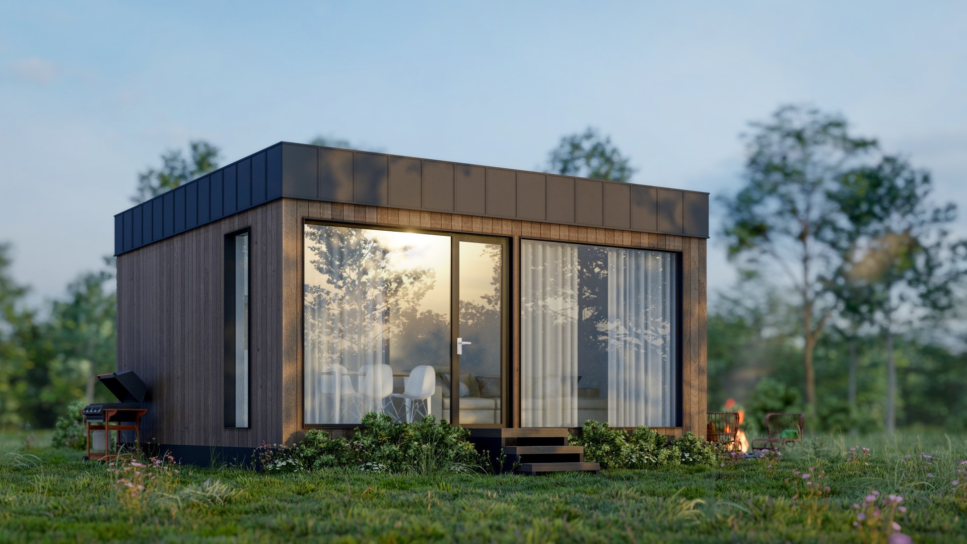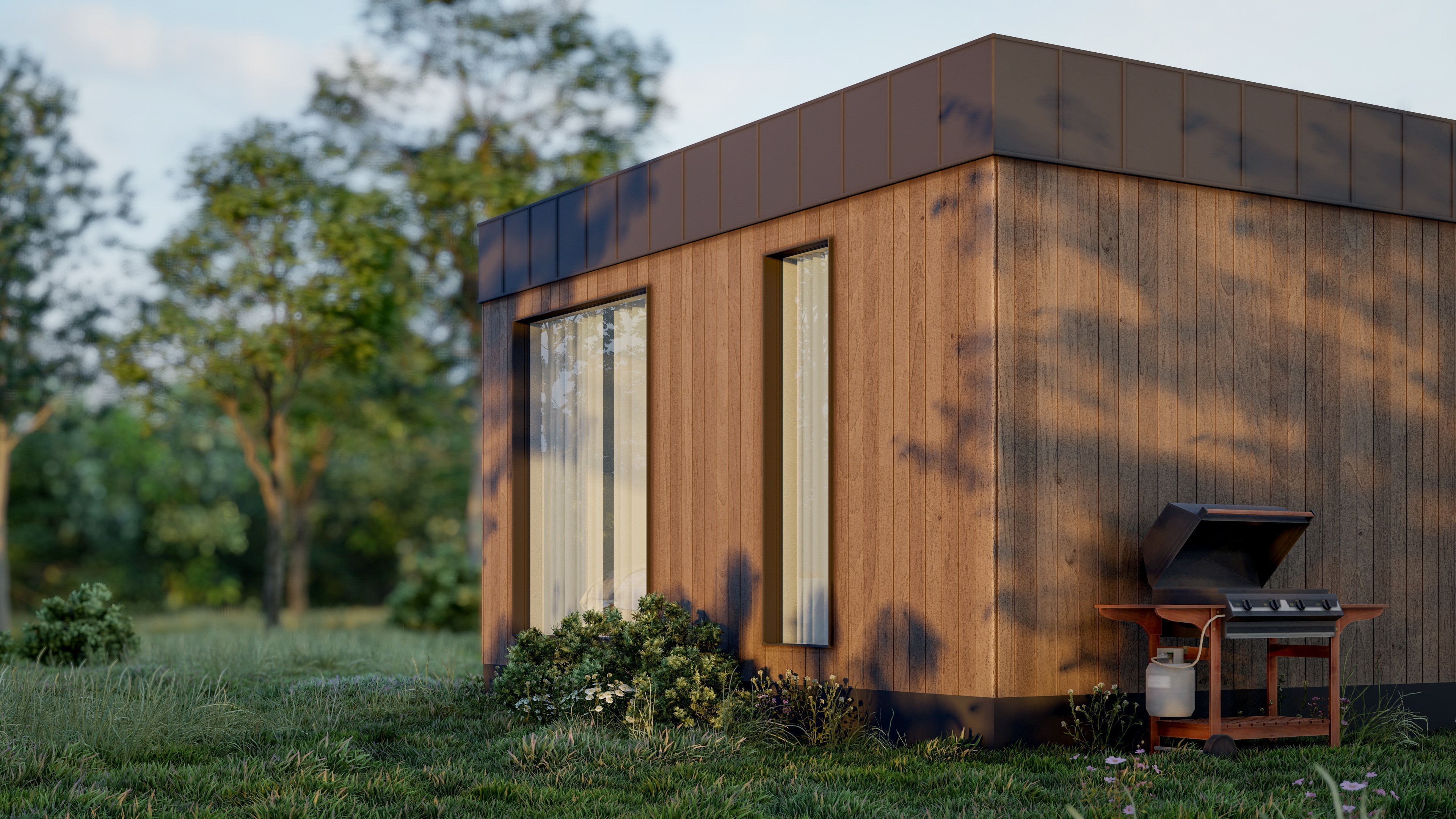 Входная дверь и распашные окна: двухкамерные стеклопакеты (4−14−4-14−4) с напылением Solar на внешнем стекле.